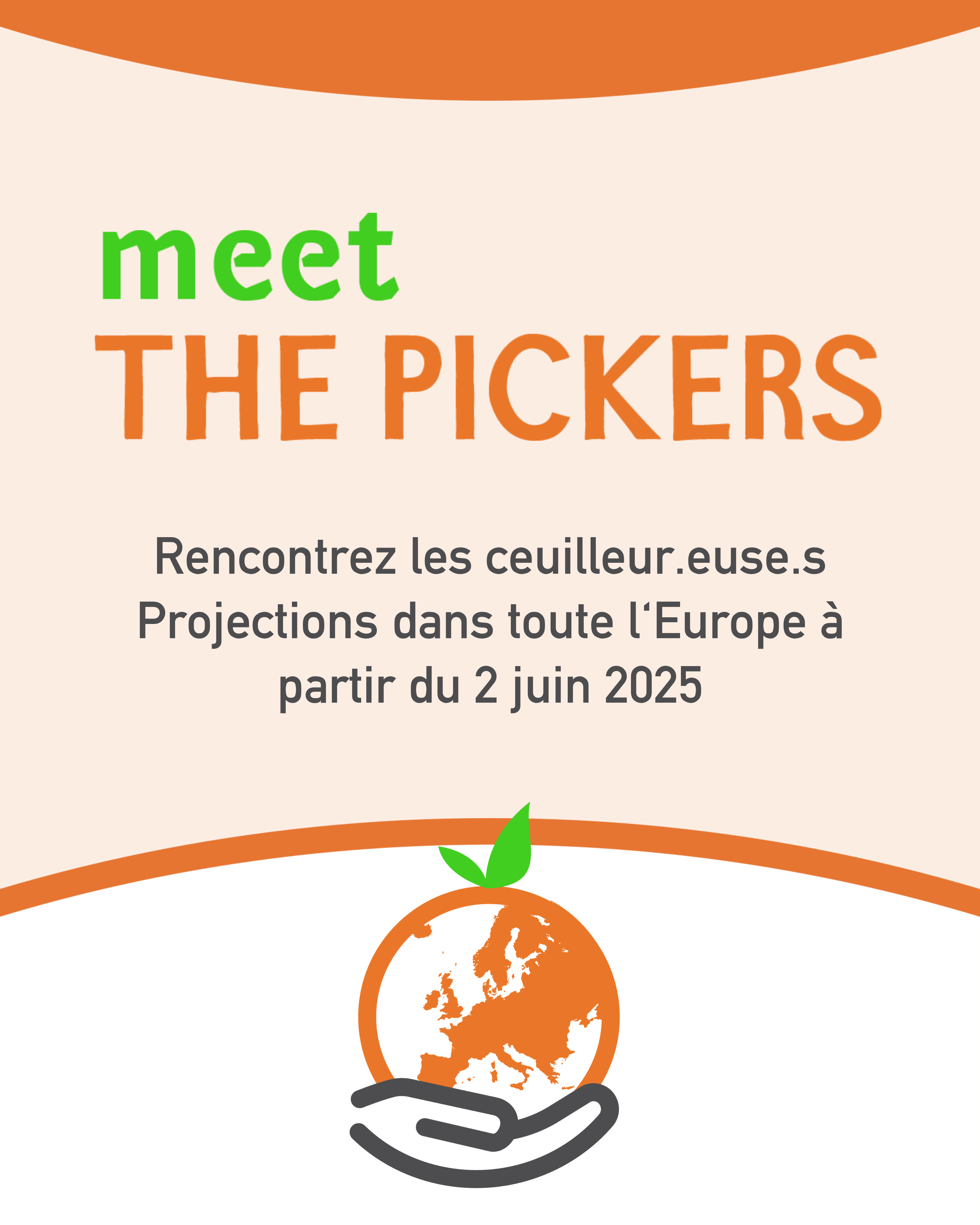 Nous soutenons la Semaine de Rencontre avec LES CUEILLEUR.EUSE.S - Meet THE PICKERS Week. Une semaine d’action qui débutera le 2 juin 2025 pour garantir que les personnes à travers l’Europe visionnent le film THE PICKERS et appellent à une CUEILLETTE et un CHOIX ÉQUITABLE qui assurent que nos aliments soient produits sans exploitation.